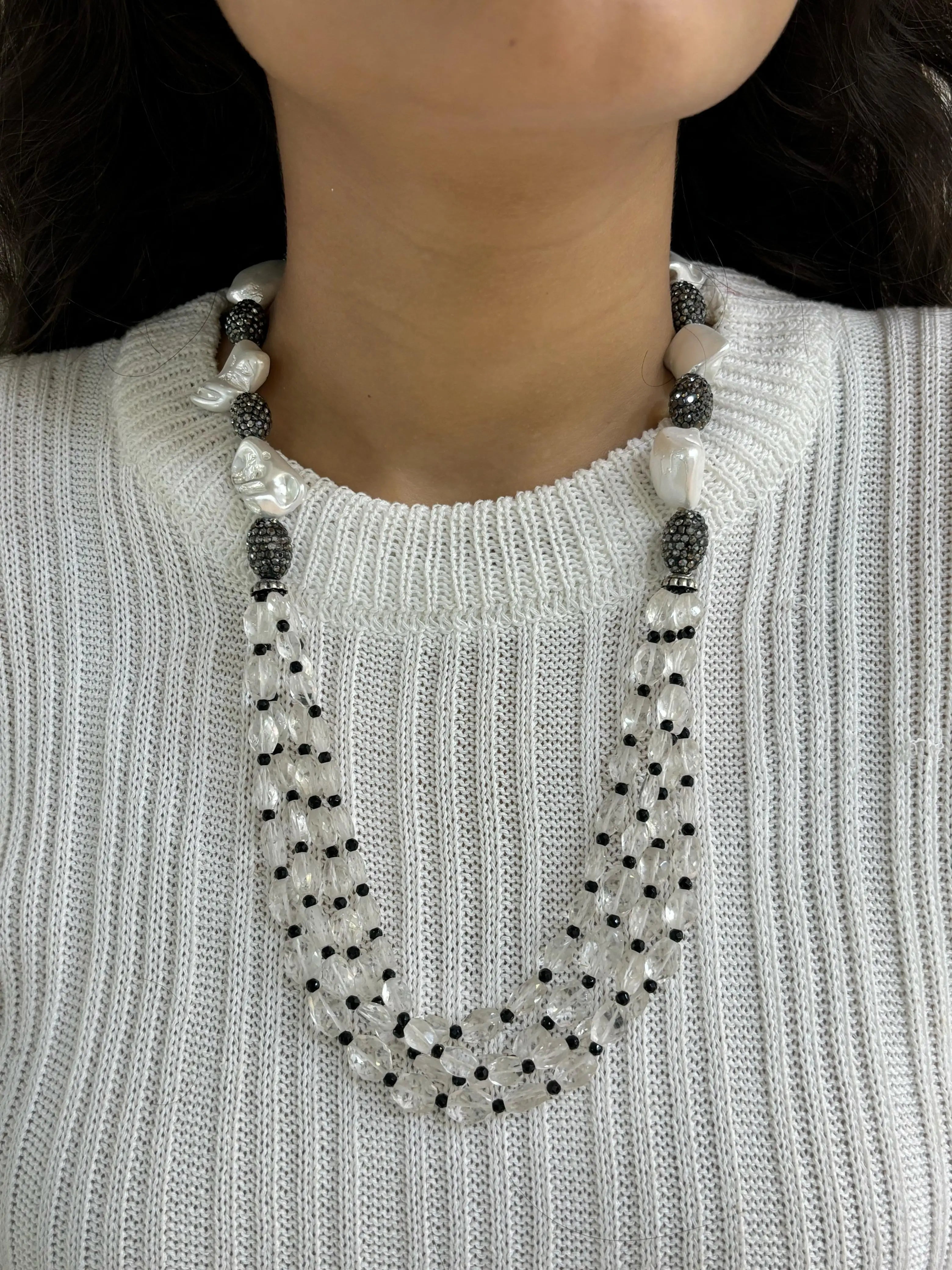 Discover the grace and beauty of our handcrafted Fancy Pearls and Natural Rock Crystal Beads Jewellery Necklace Set. Available online, this stunning set features long-faceted sphatik (natural rock crystal) beads, black crystal beads, and fancy black ad beads, carefully crafted for the modern woman. The natural faceted rock crystal beads add a serene, refreshing vibe, while the tumble-shaped pearls offer an elegant touch to your ensemble.