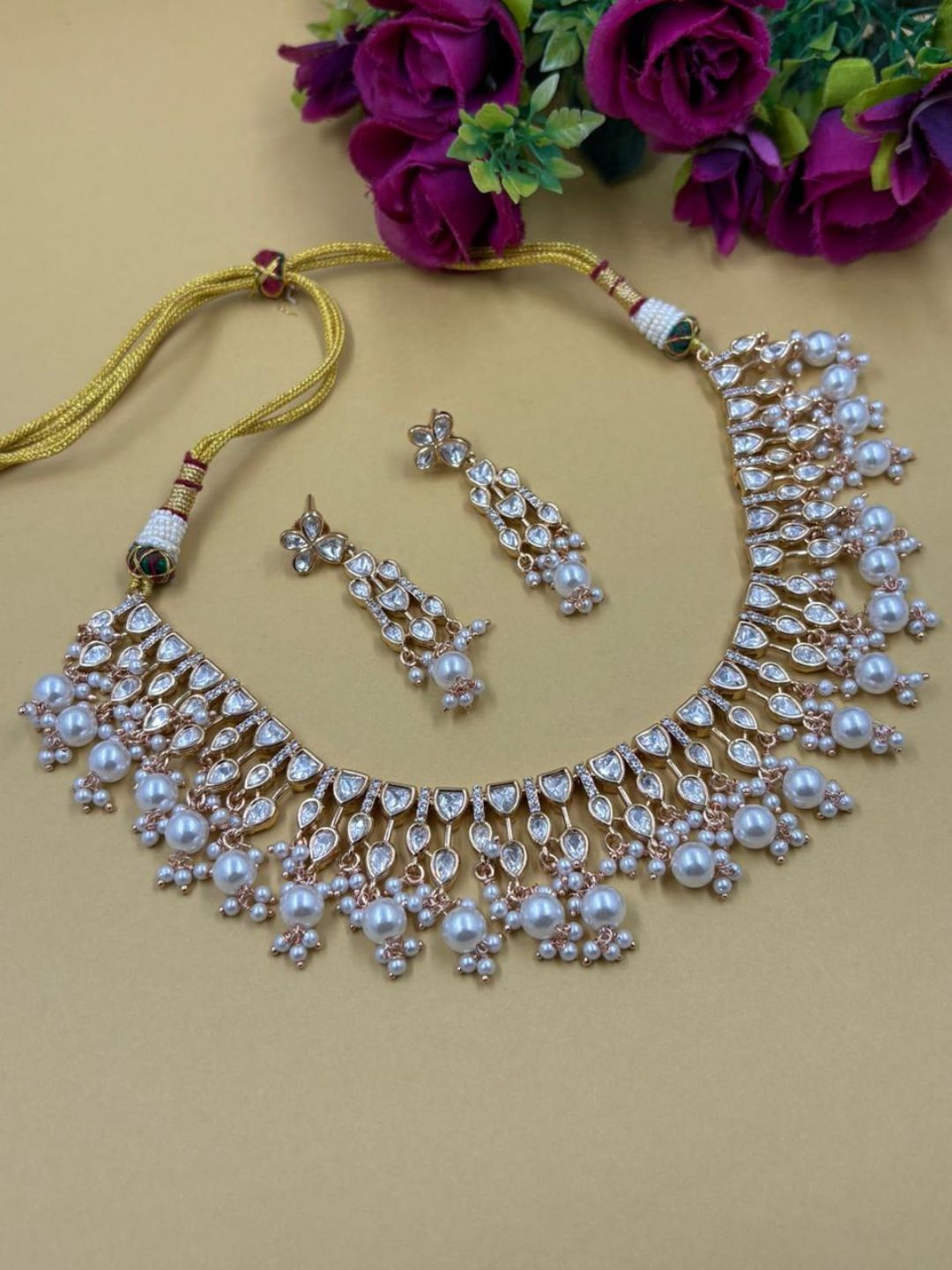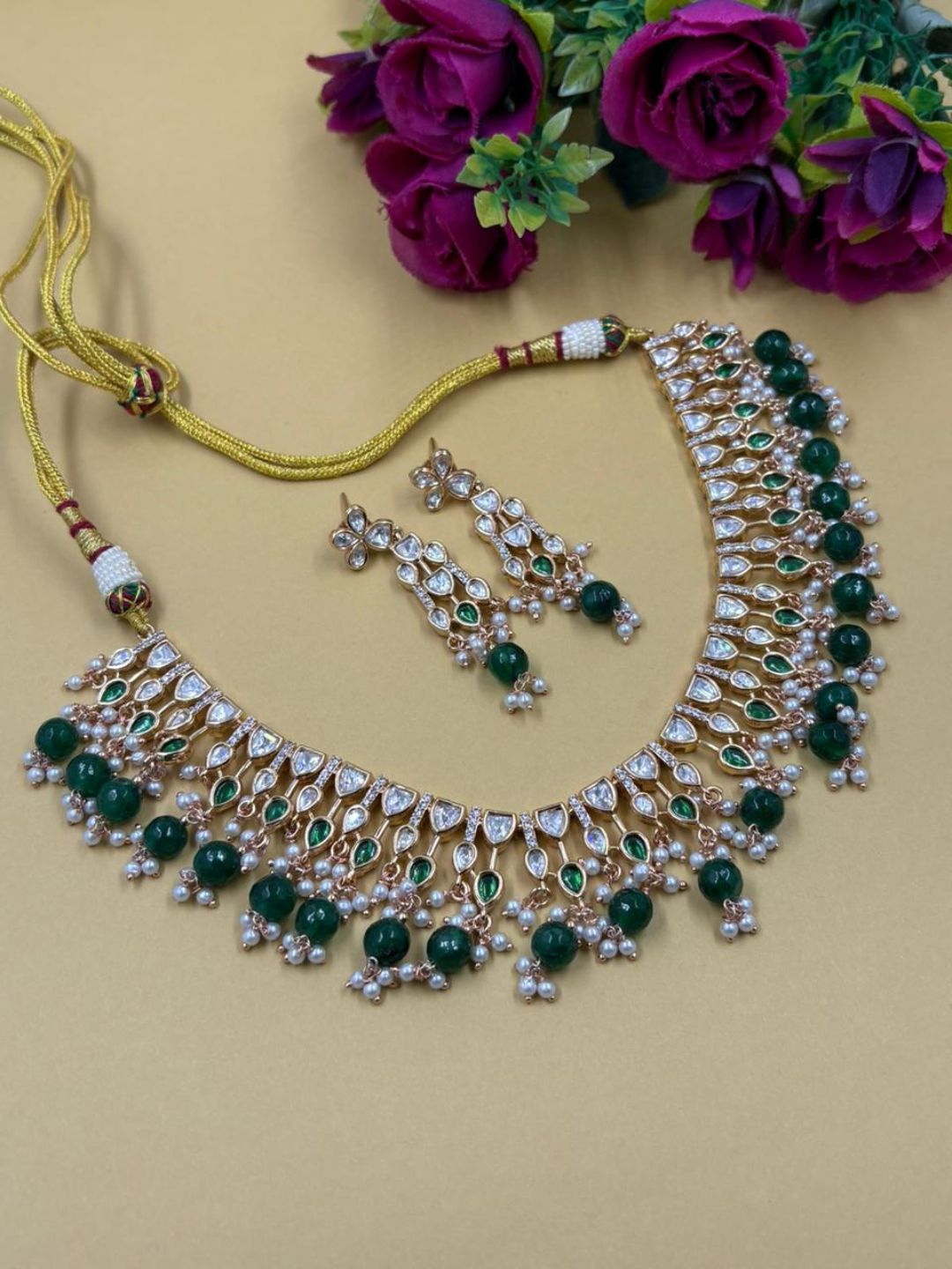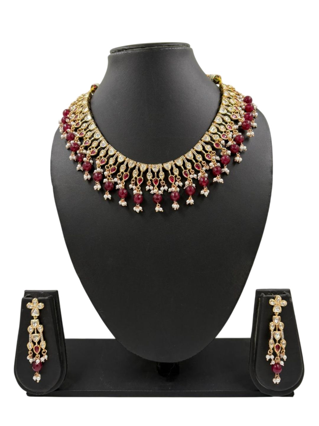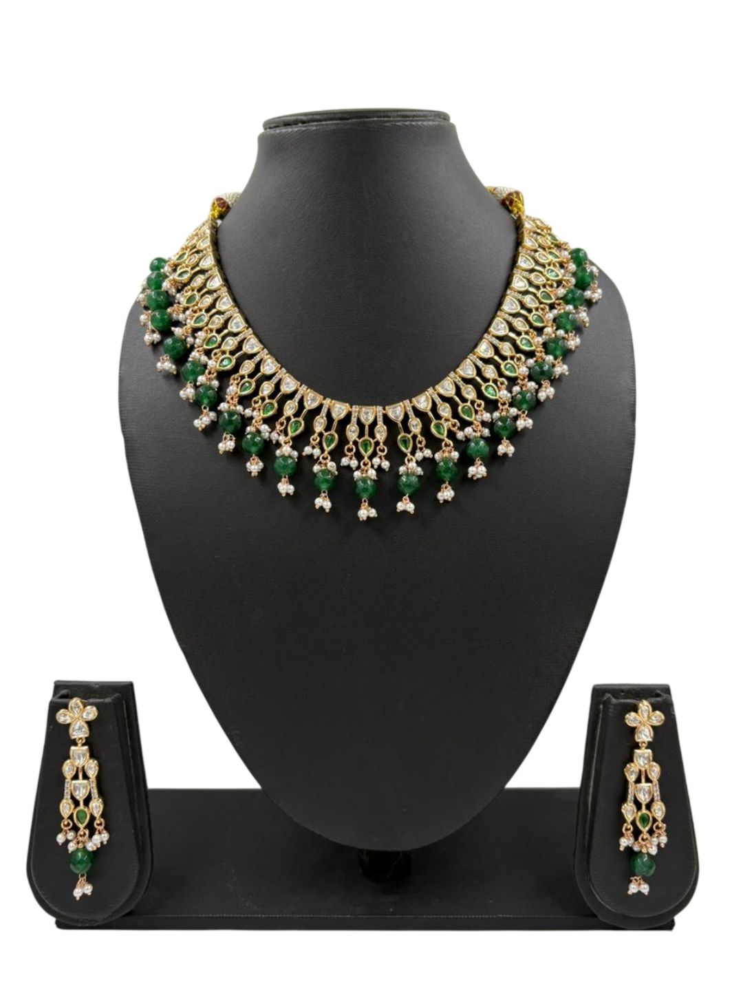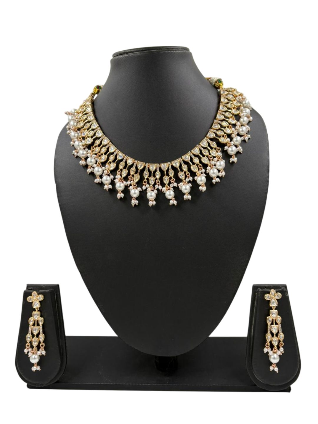The premium-quality Kundan polki stones are skillfully set in a modern necklace design, making it perfect for bridesmaids, wedding guests, and cultural events. The matching earrings complete the set, adding a touch of regal charm. The stone detailing enhances its beauty, making it a must-have for women who love traditional Indian jewelry designs with a classy touch.