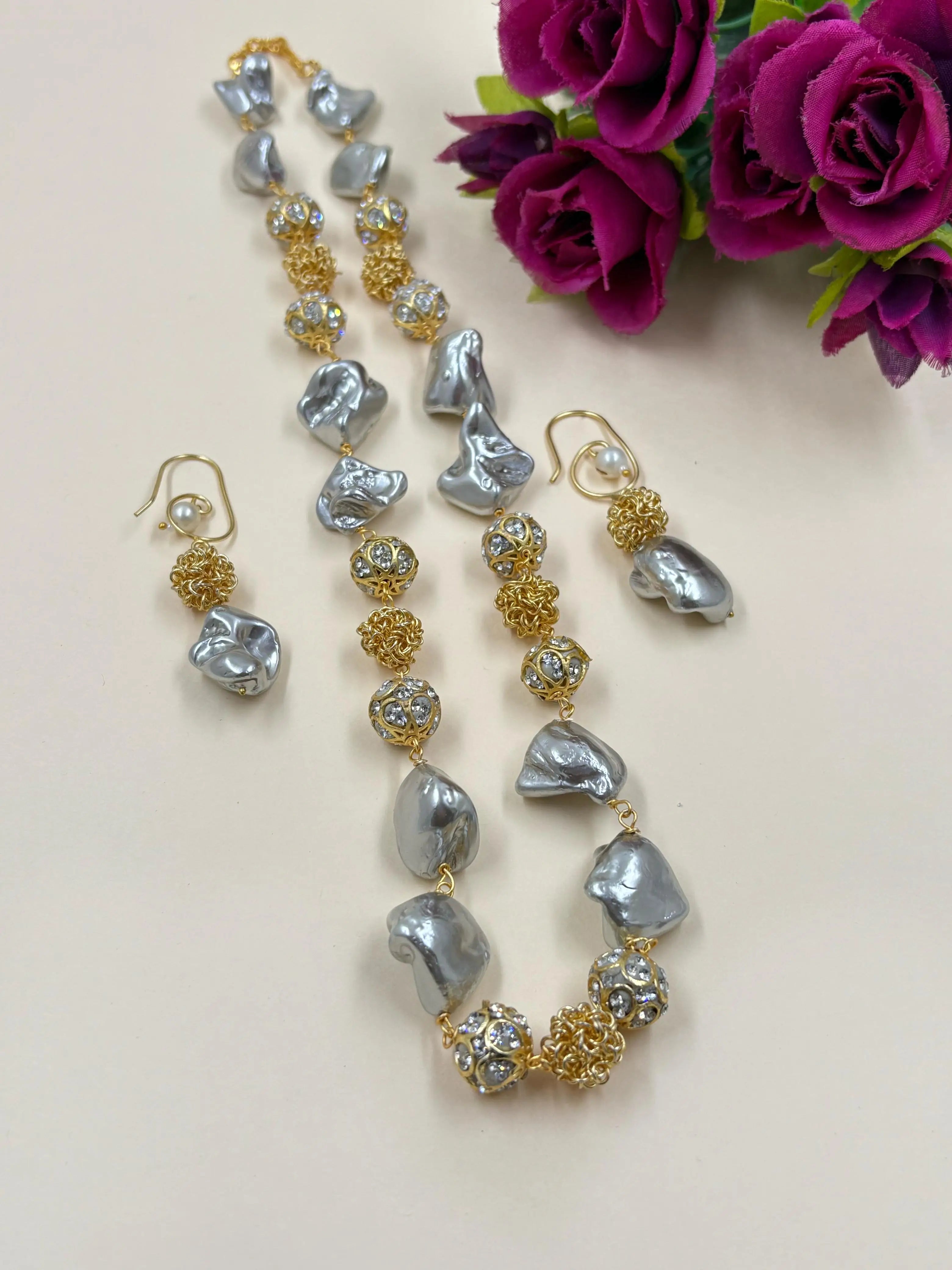 Add a touch of sophistication to your look with our Fancy Beaded Pearls Necklace set, available online. This Elegant and versatile beaded Pearl Neckace set is designed to blend elegance with tradition. This statement pearl necklace features lustrous white AAA Quality shell pearls interlinked with intricately crafted metallic AD marcasite beads, creating a classic yet contemporary appeal. Complete with matching earrings, it is ideal for enhancing both ethnic and Western outfits.