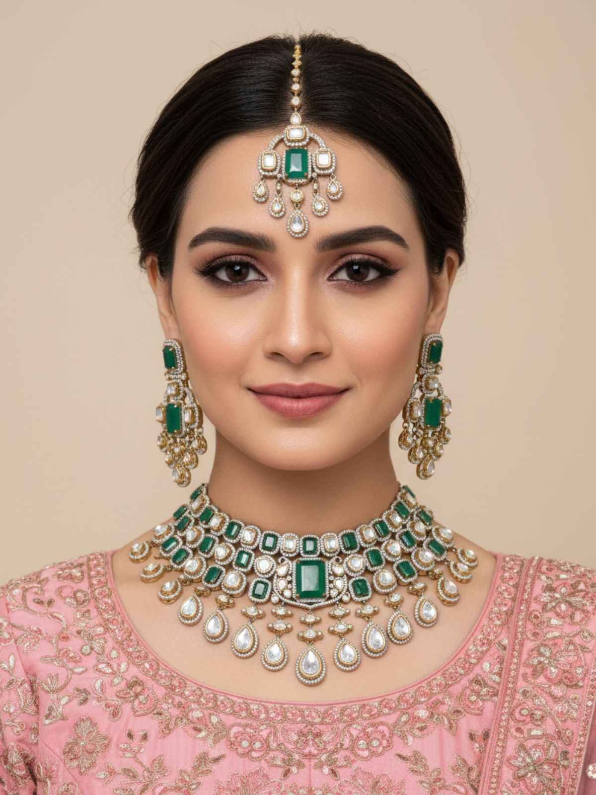 Step into the world of royal vintage charm with this next-to-real Luxury Victorian Emerald Green Kundan Choker Necklace set. Inspired by antique regal jewelry, this luxurious Bridal Polki Choker blends heritage craftsmanship and contemporary elegance. This necklace is the epitome of old-world luxury, featuring emerald-cut green doublet gemstones, uncut polki diamonds, and Victorian gold plating.