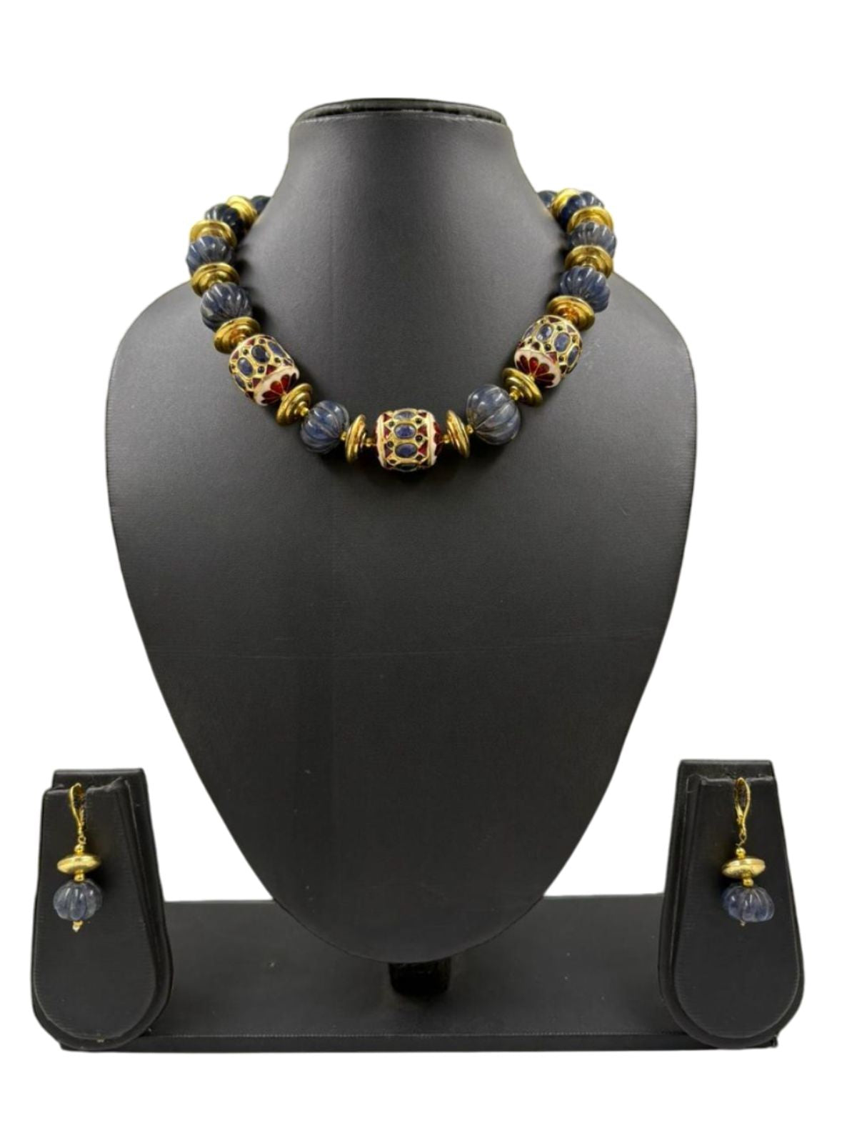 This necklace strikes the perfect balance between bold color and refined elegance. The blue hue complements the golden detailing. It brings a timeless charm to your outfits. Ideal for weddings, festive celebrations, and special occasions, this handcrafted jewelry piece embodies grace, sophistication, and artistic craftsmanship.